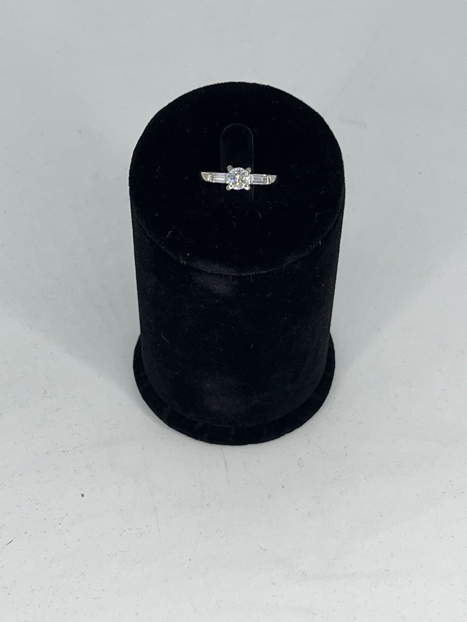 Exclusivo añillo de oro blanco de 18 quilates con un diamante central de 0.40 quilates acompañado de pequeños diamantes talla baguette en los lados. Una pieza sofisticada que combina diseño elegante con el resplandor único de los diamantes, ideal como anillo de compromiso o joya de lujo.