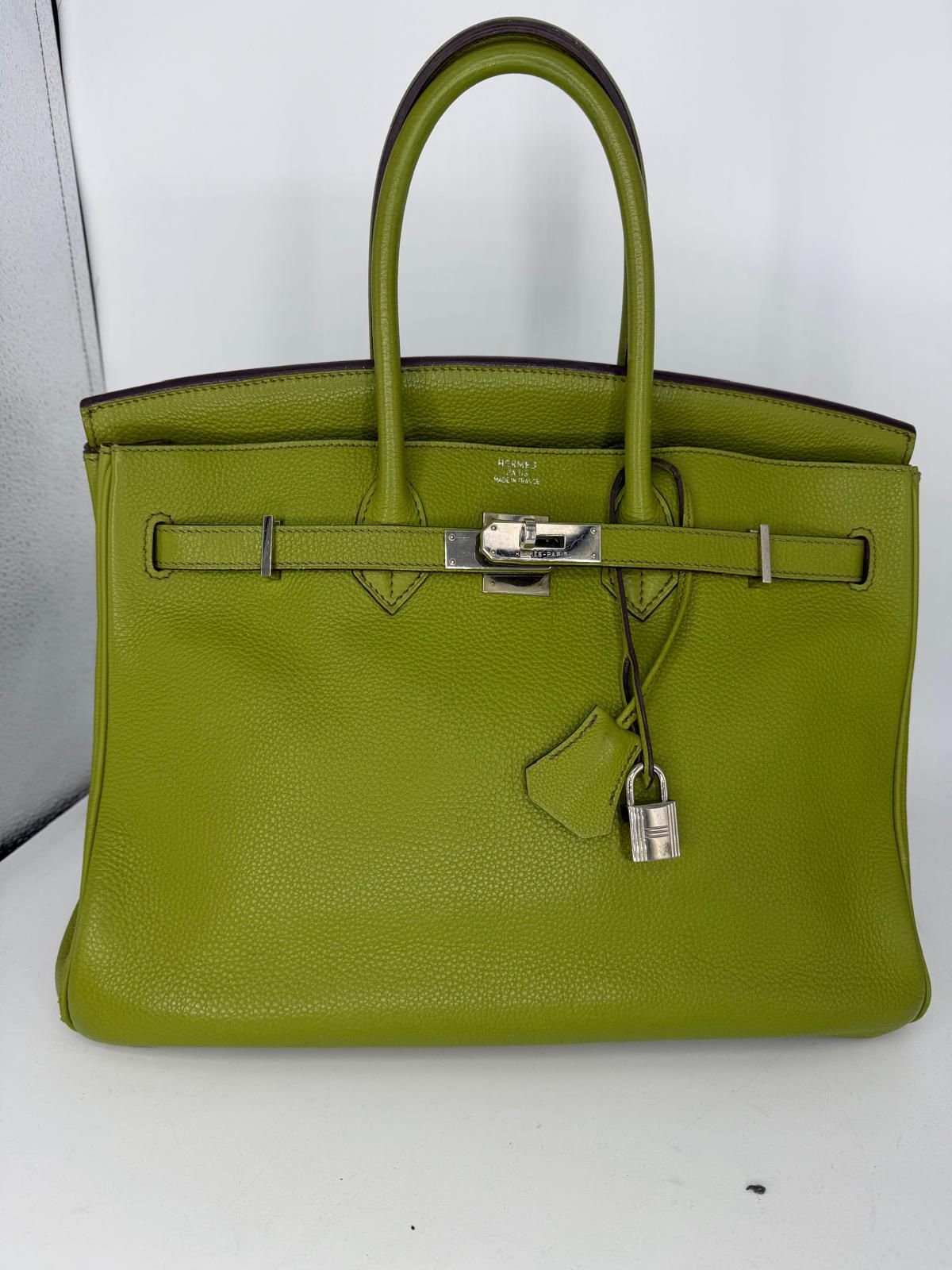 Exclusivo bolso Hermès Birkin 35 en color Verde Anis, confeccionado en cuero de alta calidad y perteneciente a la colección 2008. Cuenta con herrajes plateados e incluye llave, candado y clochette, garantizando su autenticidad y carácter icónico.