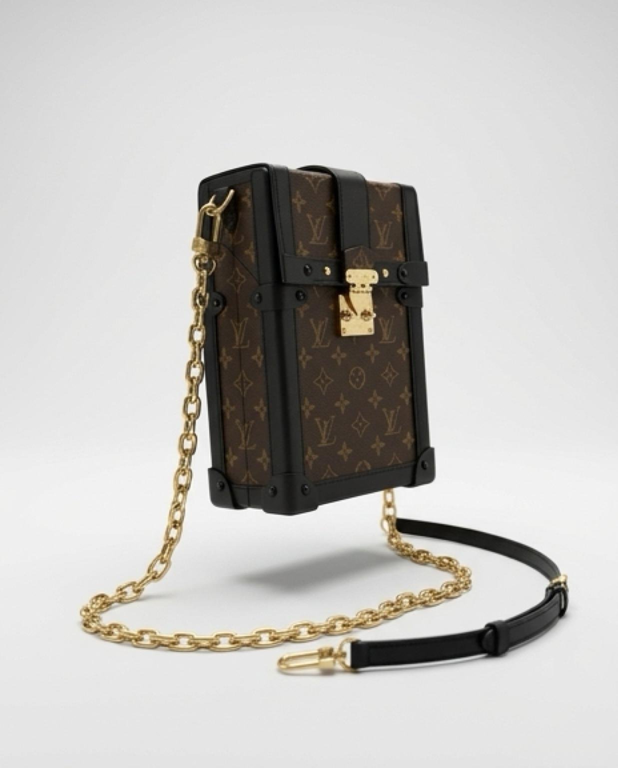 Bolso Louis Vuitton Pochette Trunk Verticale en lona Monogram con detalles inspirados en los baúles históricos, cierre S-lock y correa ajustable y extraíble.