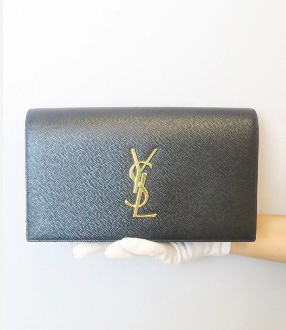 Clutch Yves Saint Laurent en cuero negro, elegante y compacto, con tarjeta de autenticidad original. Ideal para ocasiones especiales y eventos de lujo, un imprescindible en cualquier colección de bolsos premium.