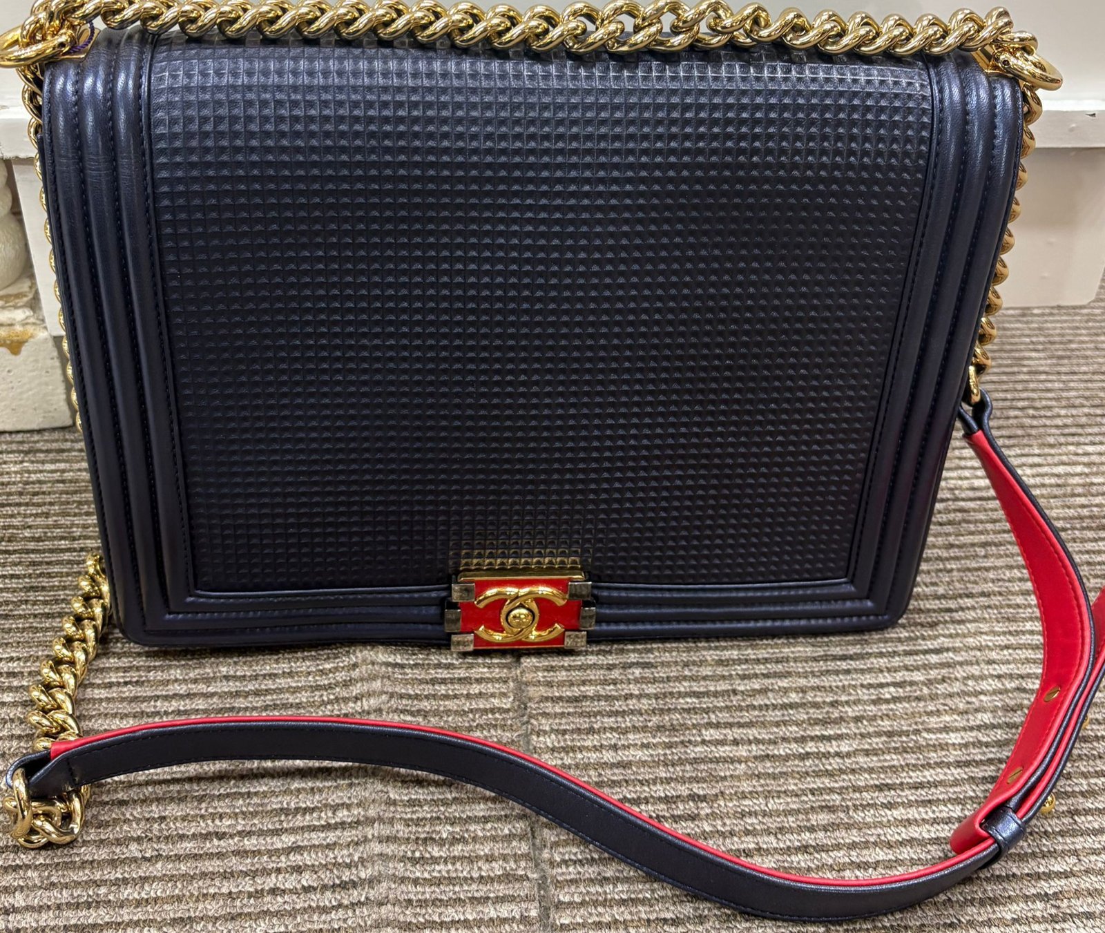 El Chanel Boy Maxi Limited Edition (2013-2014) en cuero azul con detalles rojos es un bolso icónico y exclusivo de la Maison Chanel. Diseñado como Flap Cube Shoulder, combina un diseño contemporáneo con la artesanía clásica de Chanel, convirtiéndose en un accesorio elegante y llamativo.