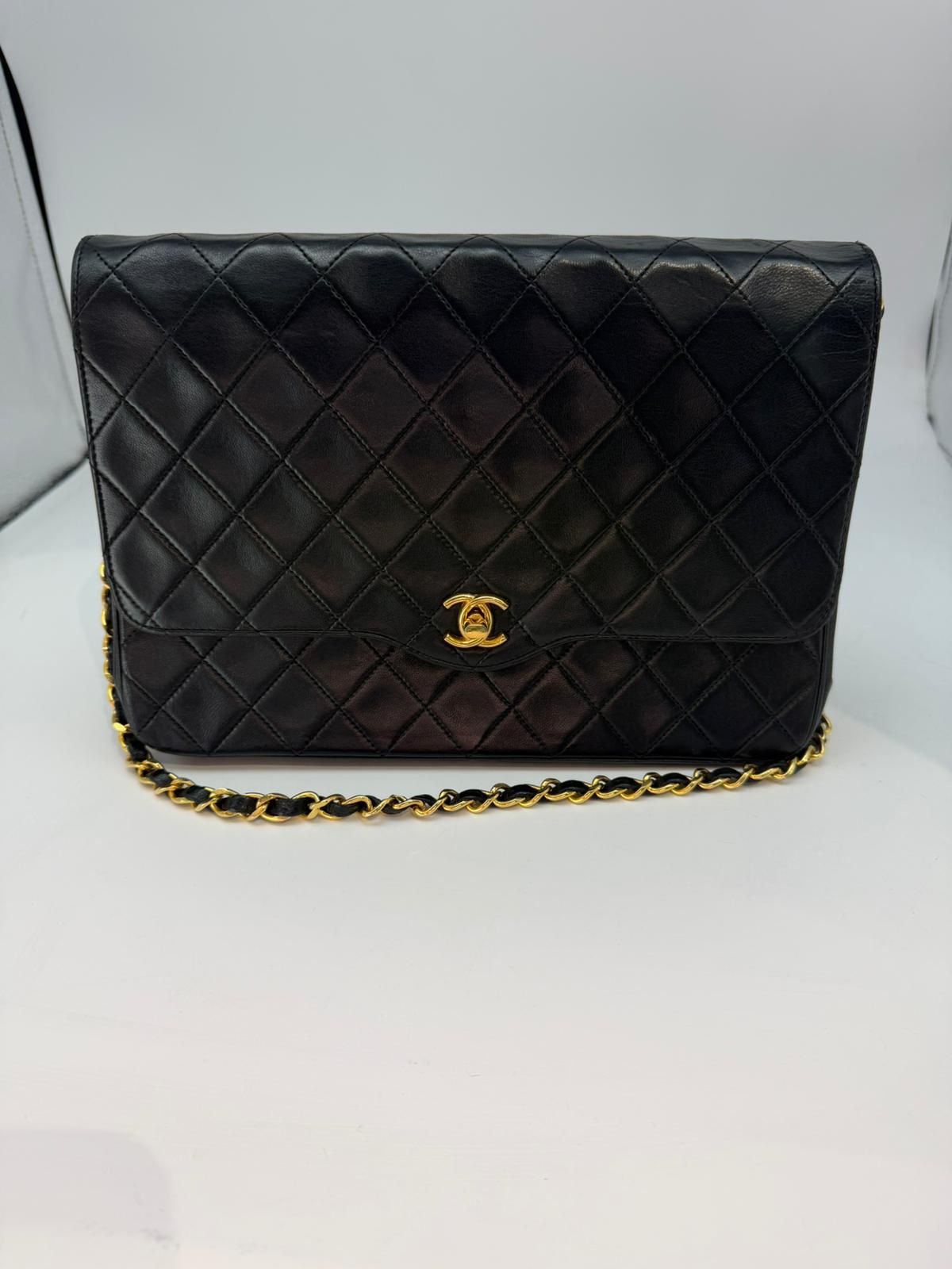 Bolso Chanel Timeless Classique en cuero negro con herrajes dorados. Modelo vintage icónico, reconocido por su elegancia, versatilidad y valor en el mercado de lujo.