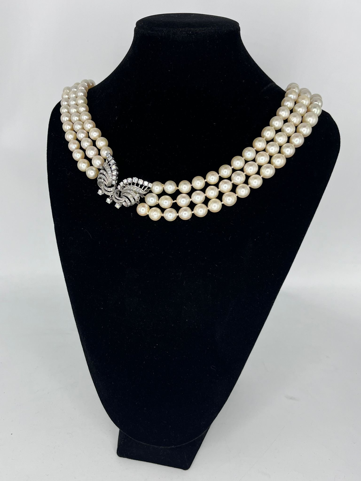 Collar de perlas de 3 rangos con cierre de oro blanco de 18k y diamantes