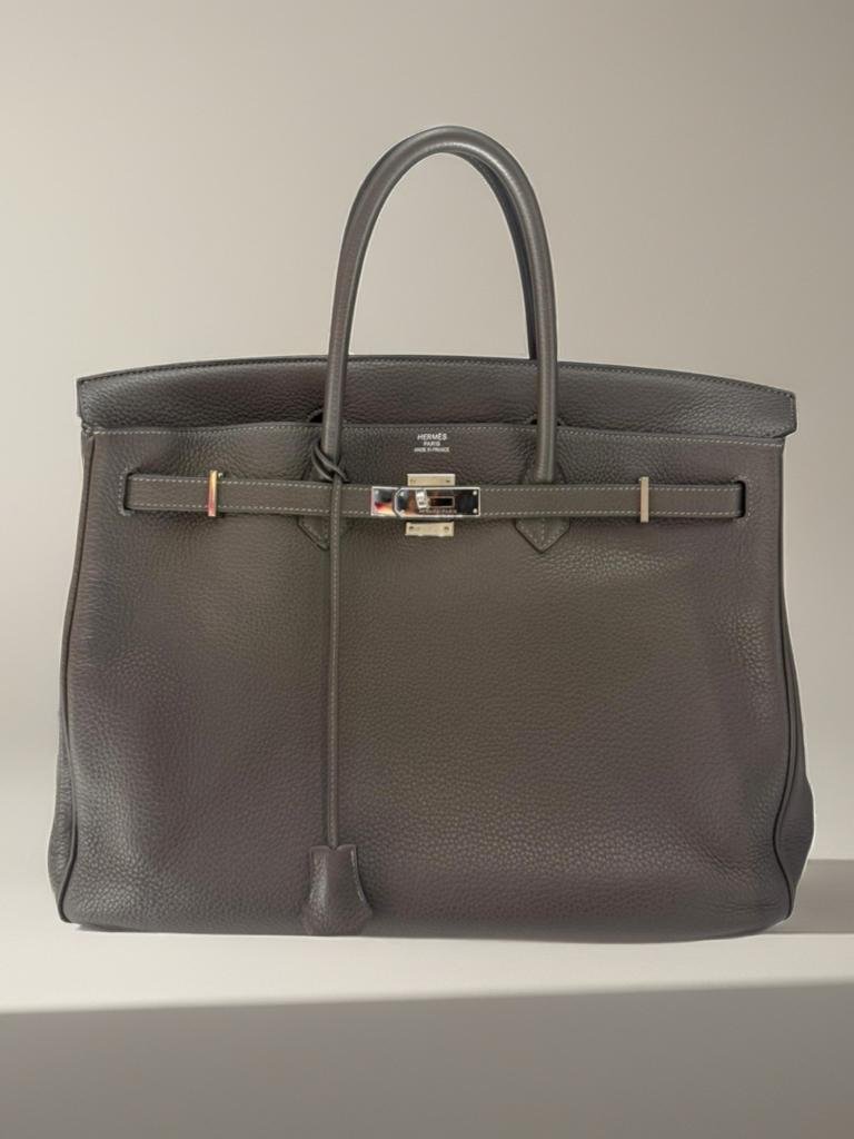 Bolso Hermès Birkin 40 confeccionado en cuero gris oscuro con herrajes plateados. Un modelo icónico, espacioso y altamente valorado en el mercado del lujo.