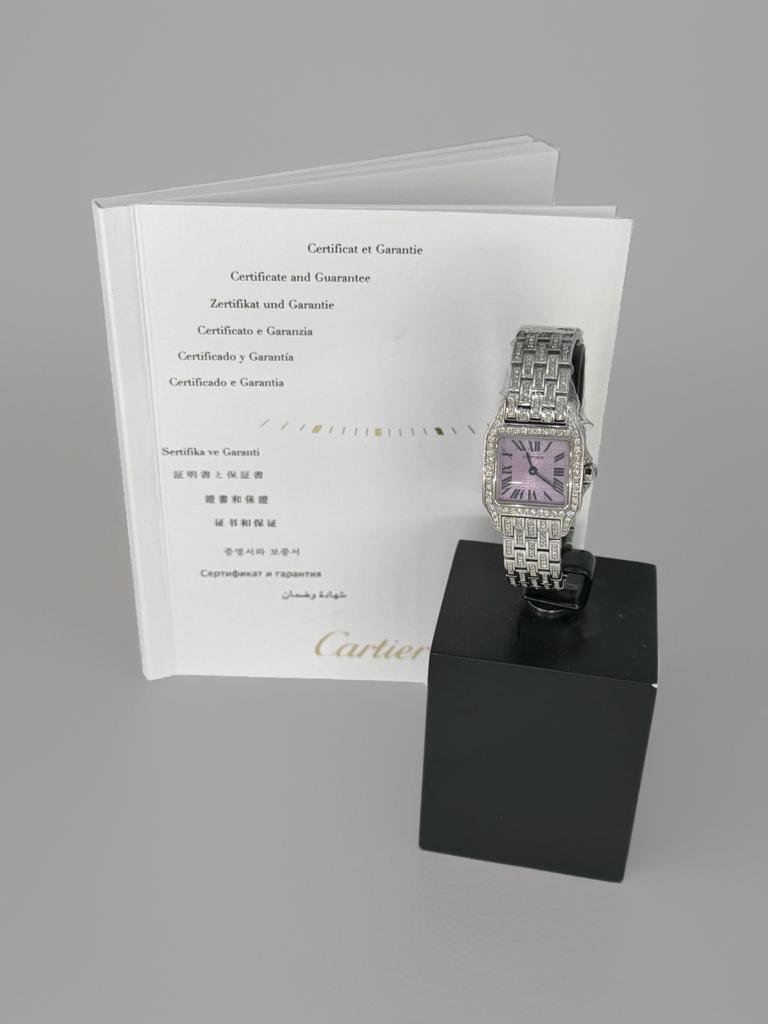 Reloj Cartier modelo Demoiselle fabricado en acero, con diamantes engastados y elegante esfera rosa. Incluye sus papeles originales. Una pieza femenina, sofisticada y atemporal.